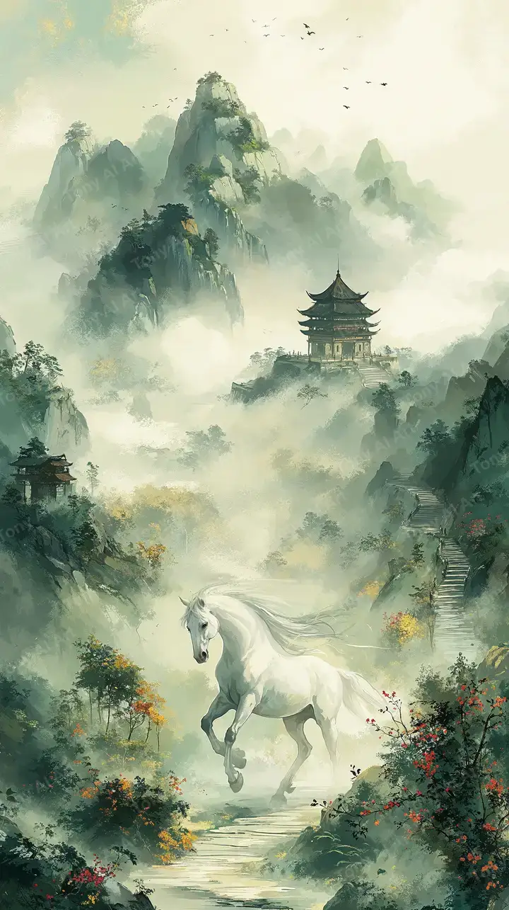 Hình nền ngựa trắng phong thủy, tranh sơn mực AI art 4K, núi mây huyền ảo, tải miễn phí.