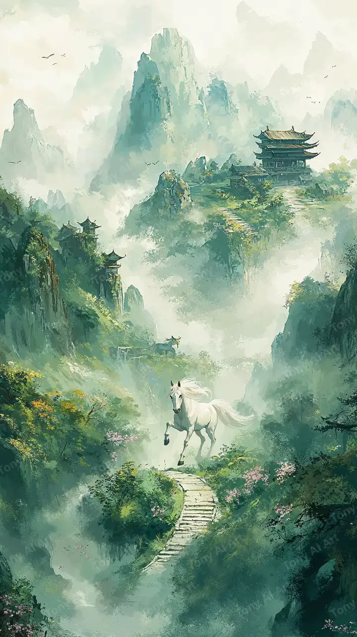Hình nền ngựa trắng sương mù phong cảnh Trung Hoa cổ điển, pagoda phong thủy, tải miễn phí 4K.