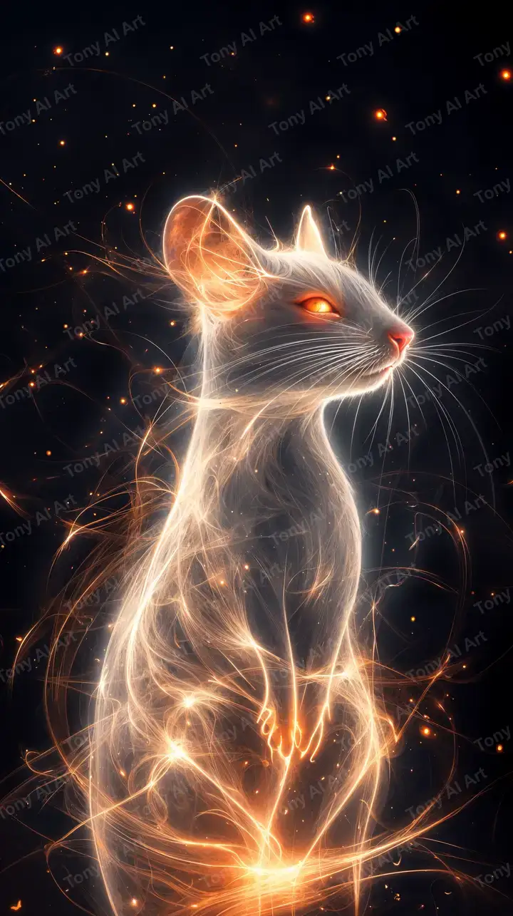 Hình nền mèo neon AI art với hiệu ứng cosmic glow và light particles, tải miễn phí 4K.