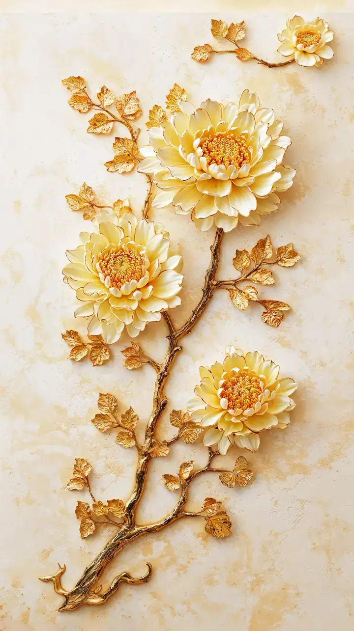 Hình nền hoa sen vàng luxury AI art, nhánh cây chi tiết, nền kem trắng, hiệu ứng glow 3D, tải miễn phí 4K.
