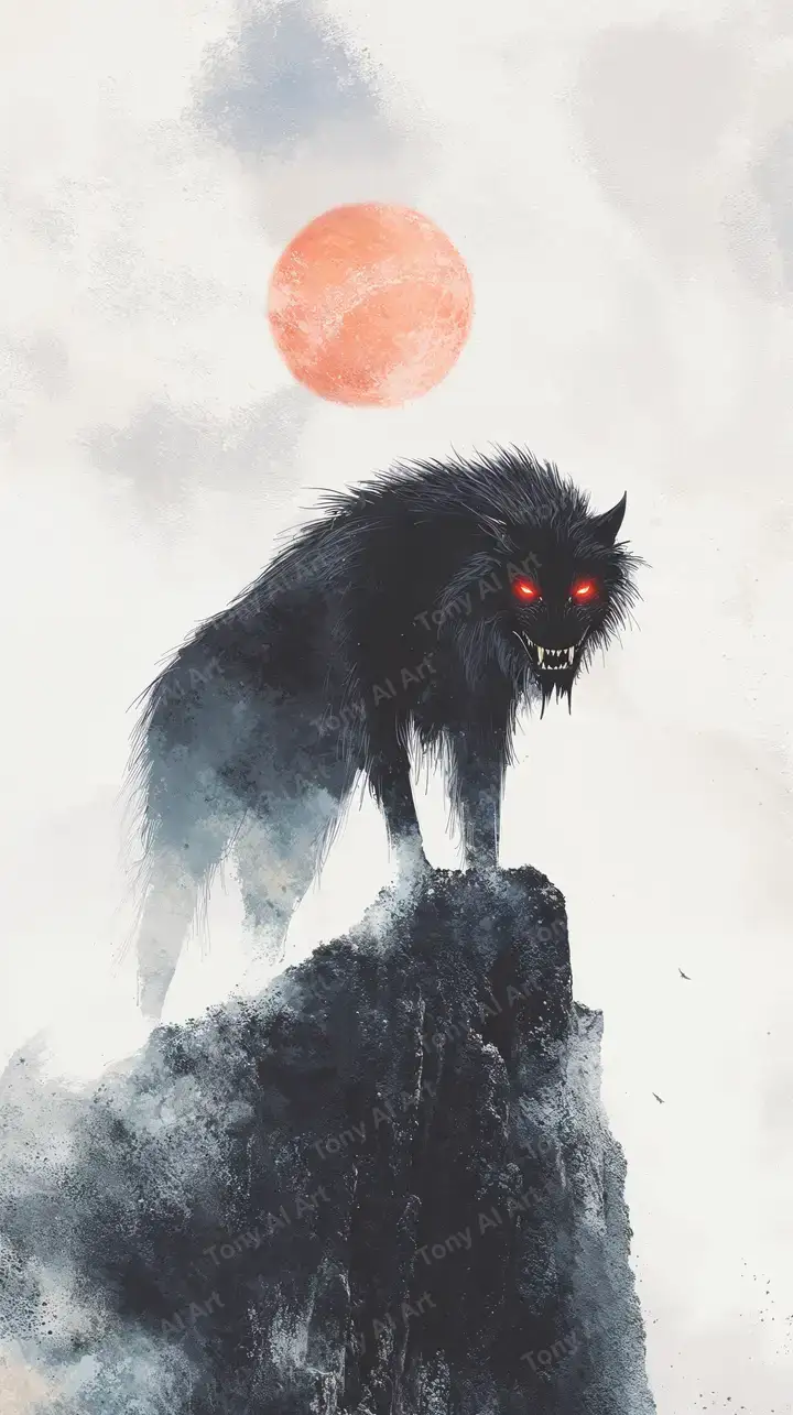 Hình nền sói huyền bí watercolor AI art, mặt trăng đỏ, hiệu ứng mù sương, đứng trên đỉnh núi, phong cách tối giản tải miễn phí 4K.