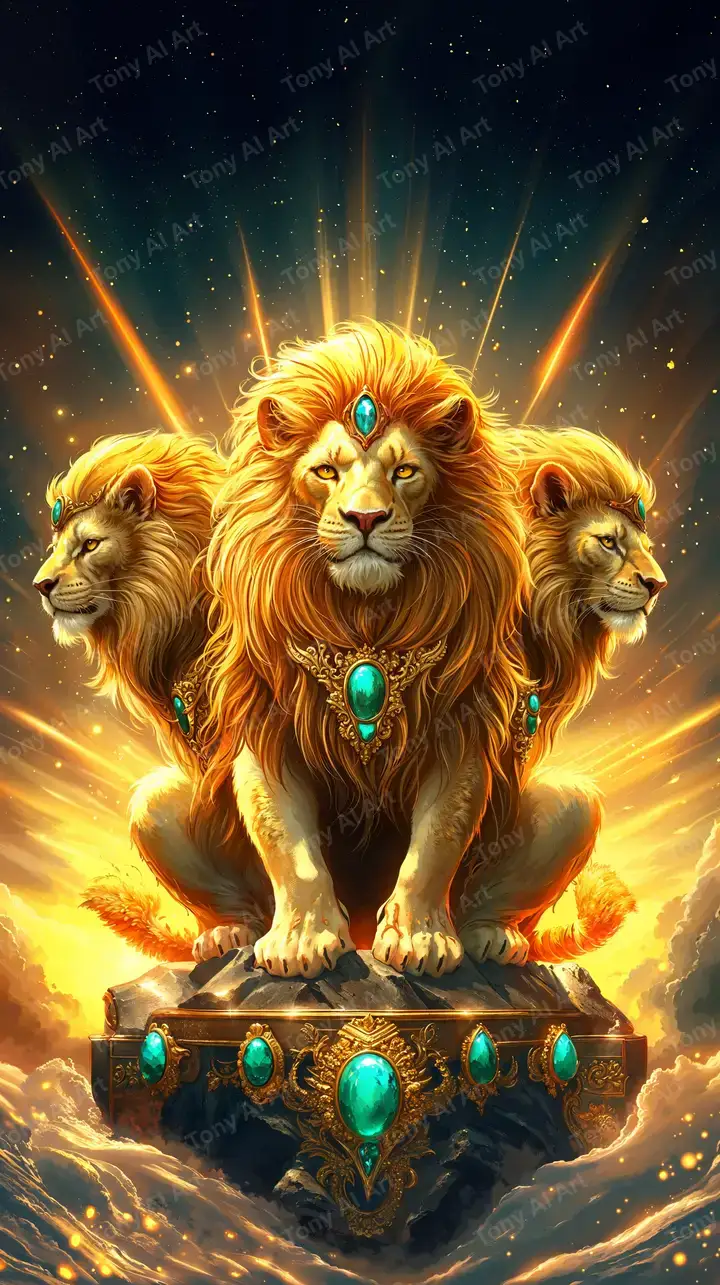 Hình nền ba sư tử vàng linh thiêng với ngọc turquoise, hiệu ứng neon cosmic tỏa sáng, đầy uy lực và huyền bí.