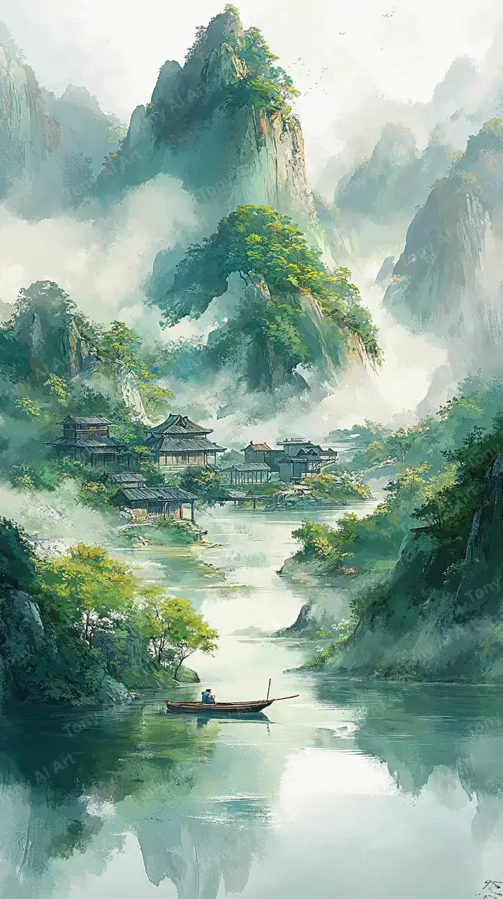 Hình nền AI art phong cảnh sơn thủy Á Đông, sương mù huyền bí, tải miễn phí 4K.