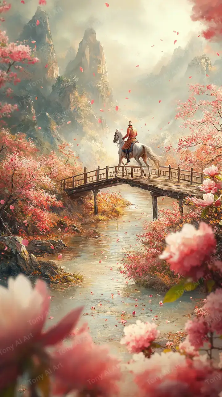 Hình nền AI art nữ chiến binh cưỡi ngựa giữa vườn hoa anh đào, cầu gỗ cổ, nền núi mây mù. Tải miễn phí 4K.