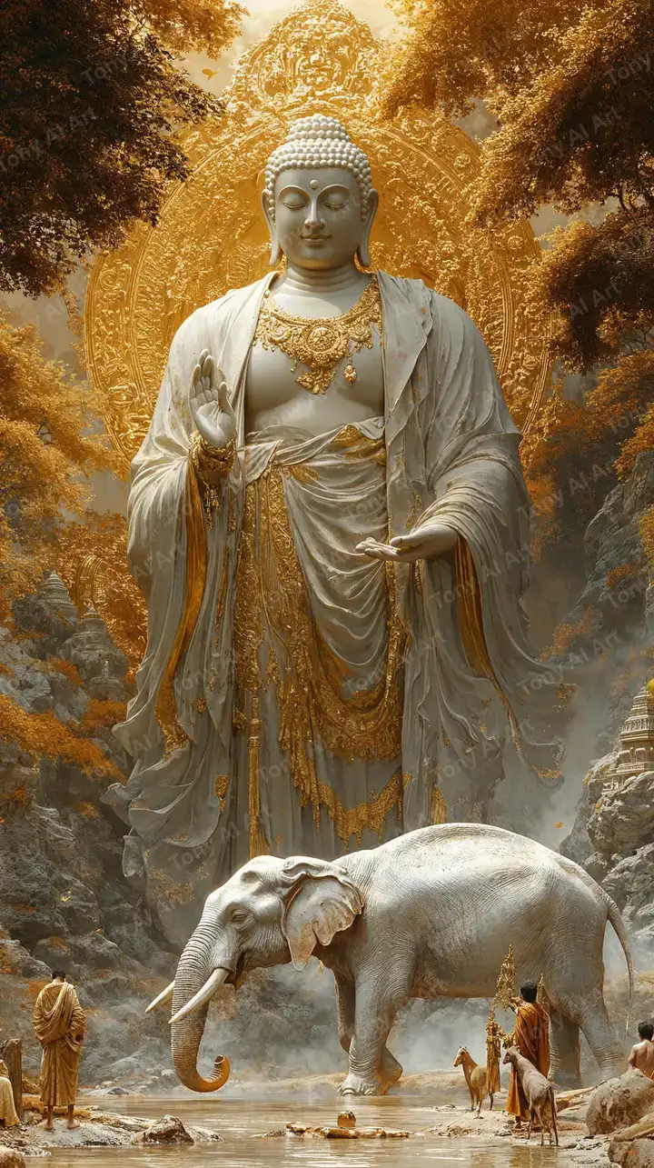 Hình nền Phật vàng phong thủy AI art, voi thanh bình, hiệu ứng halo thiêng liêng, tải miễn phí 4K HD.