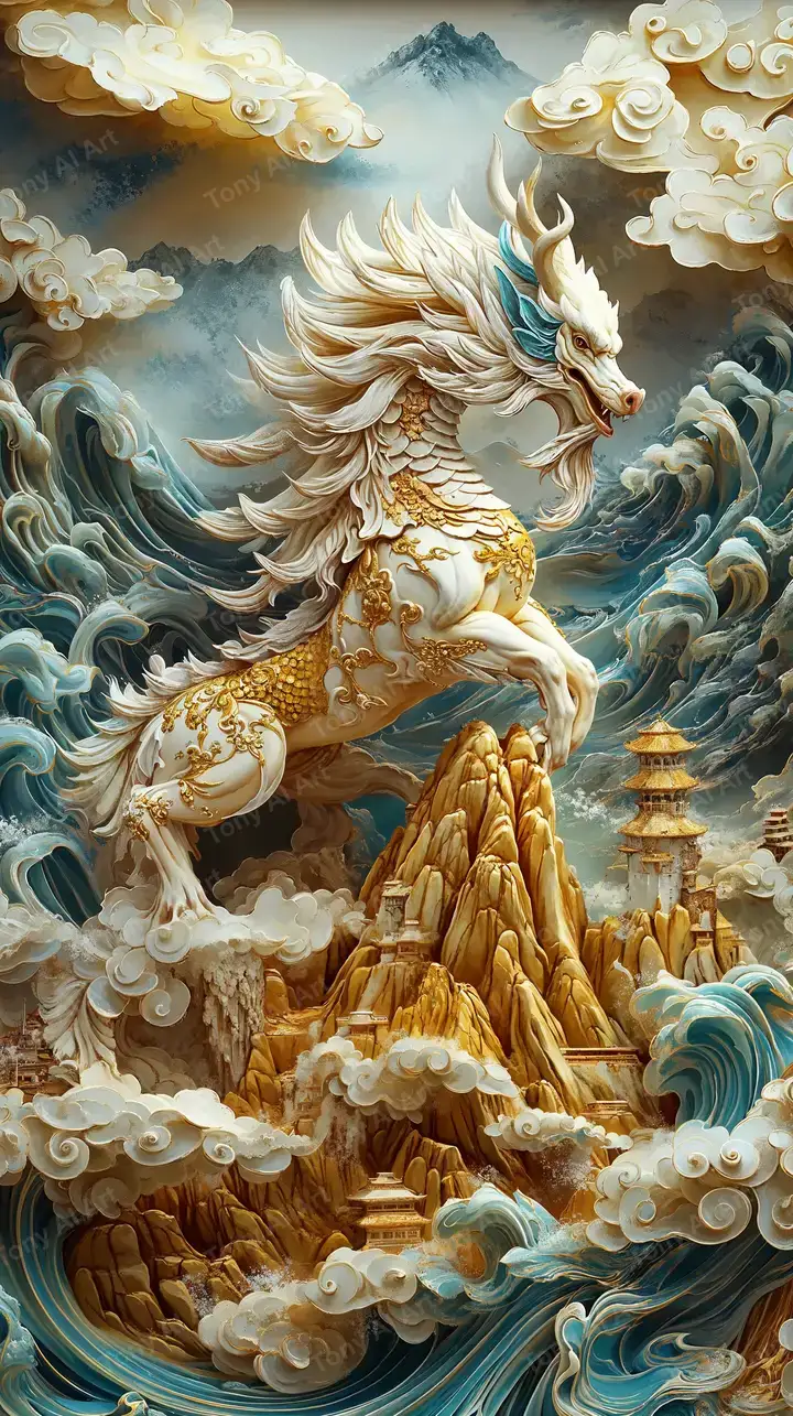 Hình nền rồng vàng phong thủy AI art, hiệu ứng neon chi tiết cao, núi đá vàng, sóng nước xanh, tải miễn phí 4K.