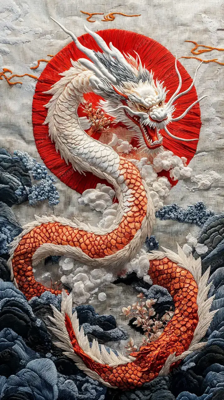 Hình nền rồng đỏ phong thủy AI art với hiệu ứng neon, chi tiết 3D dập nổi, mặt trời vàng huyền bí. Tải miễn phí 4K.