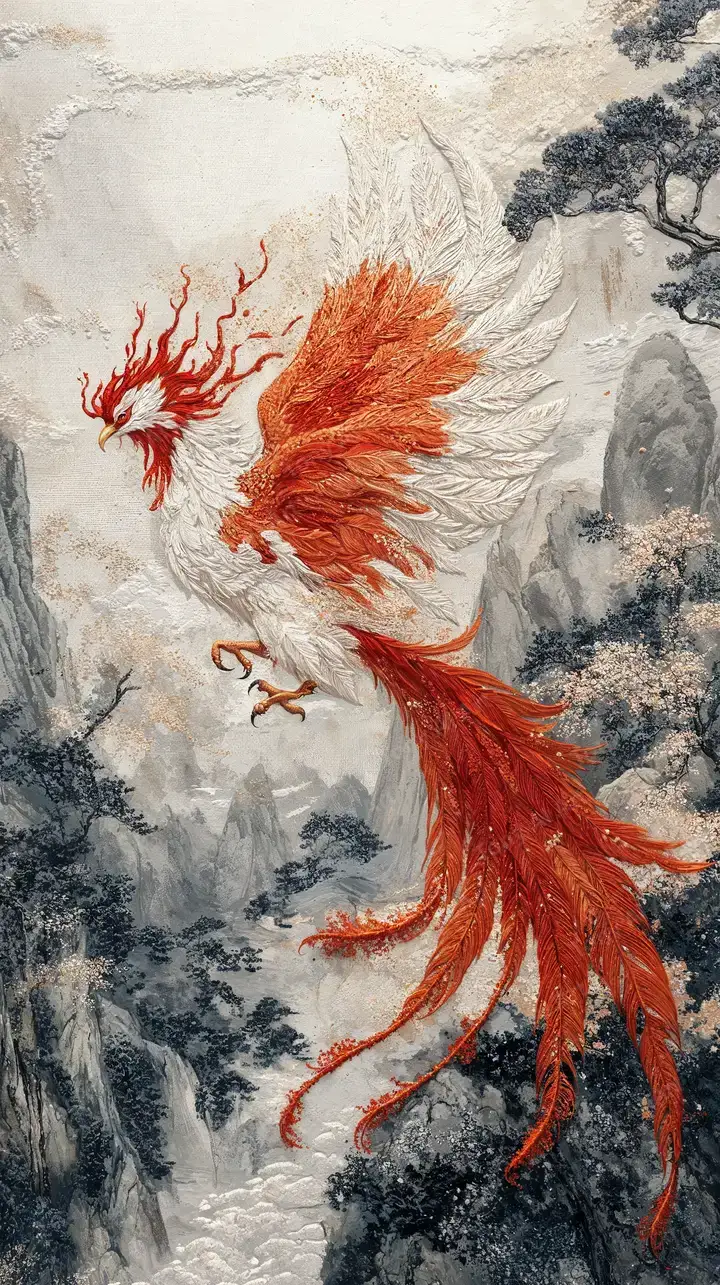 Hình nền phượng hoàng đỏ phong thủy AI art, hiệu ứng vẽ mực truyền thống Á Đông, tải miễn phí 4K.