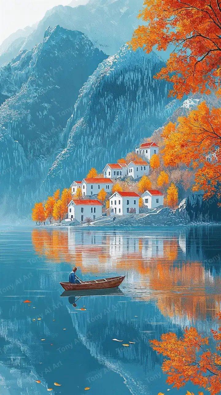 Hình nền AI art phong cảnh làng quê ven hồ mùa thu, núi tuyết, phản chiếu nước, tải miễn phí 4K.