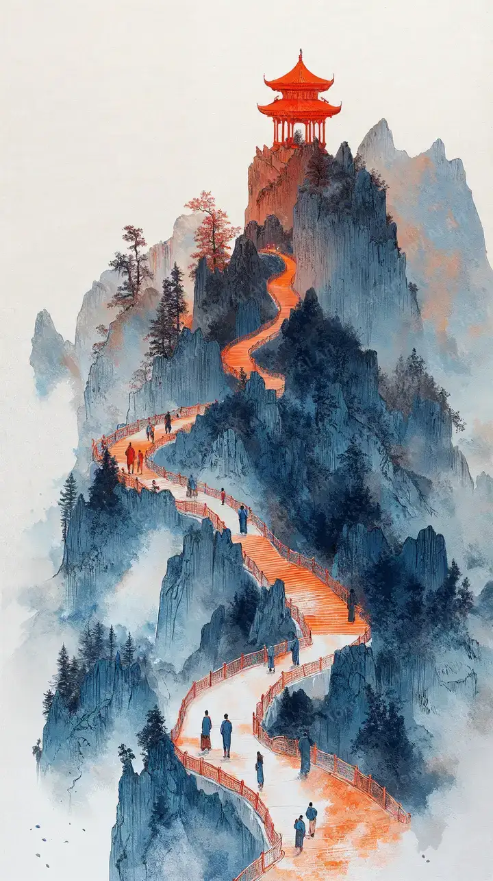 Hình nền chùa núi xanh dương với đường neon cam, phong thủy AI art, hiệu ứng sương mù ethereal, tải miễn phí 4K.