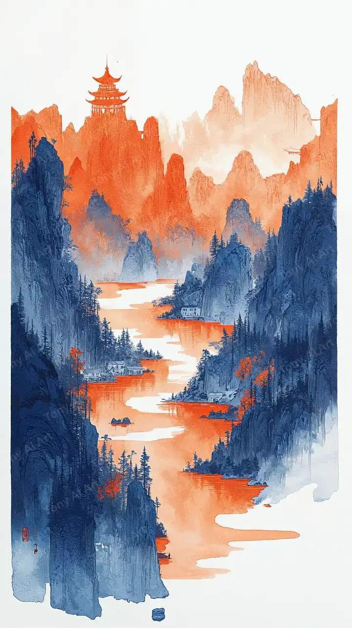 Hình nền núi non tháp chùa phong cảnh Á Đông, style sơn mực watercolor, màu xanh cam gradient, AI art 4K tải miễn phí.