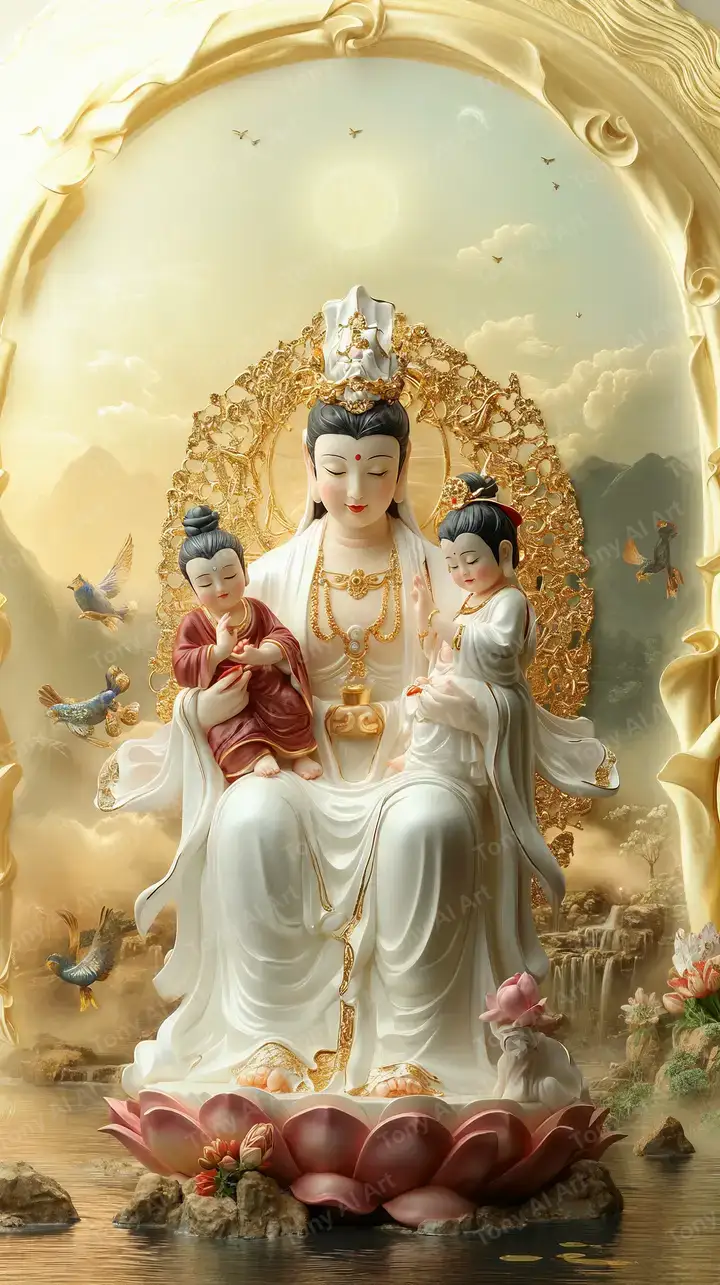 Hình nền Phật Bà Quan Âm vàng AI art 4K, phong thủy cao cấp với hiệu ứng neon cosmic, hào quang thiêng liêng, tải miễn phí.