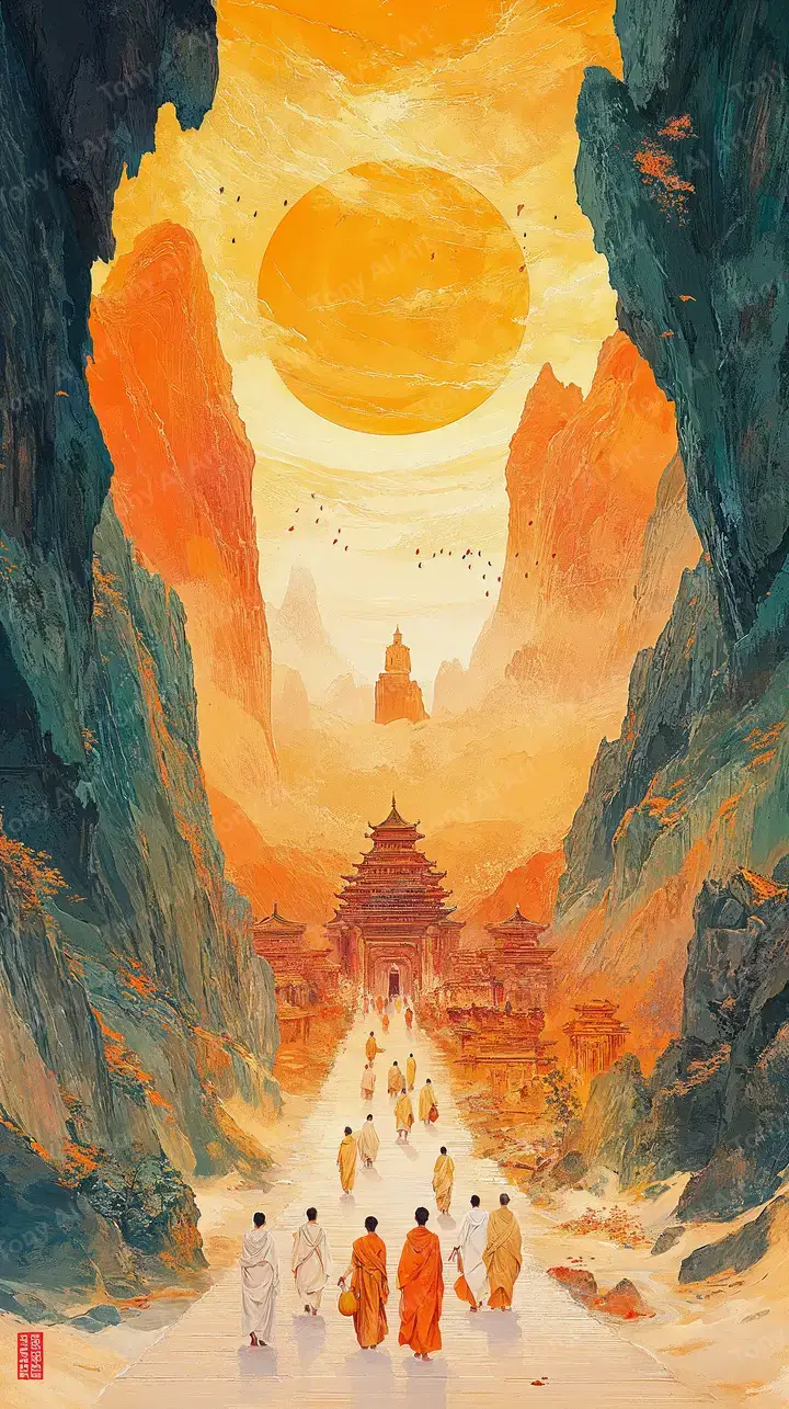 Hình nền đền thờ Việt Nam tuyệt đẹp: vàng cam linh thiêng, nhà sư, núi đá xanh, ánh sáng halo cosmic, hiệu ứng painting AI, tải miễn phí 4K.