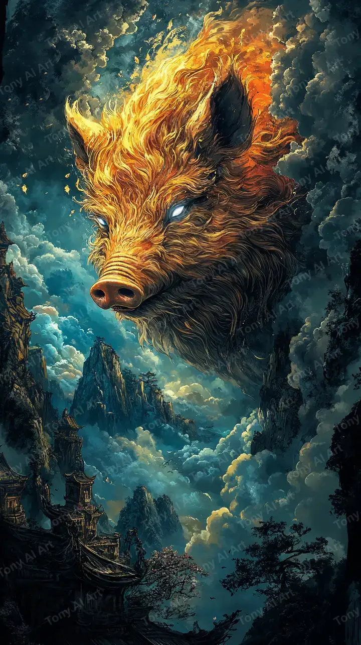 Hình nền lợn thần thoại phong thủy AI art, hiệu ứng lửa vàng cosmic, cảnh bầu trời huyền bí 4K tải miễn phí.