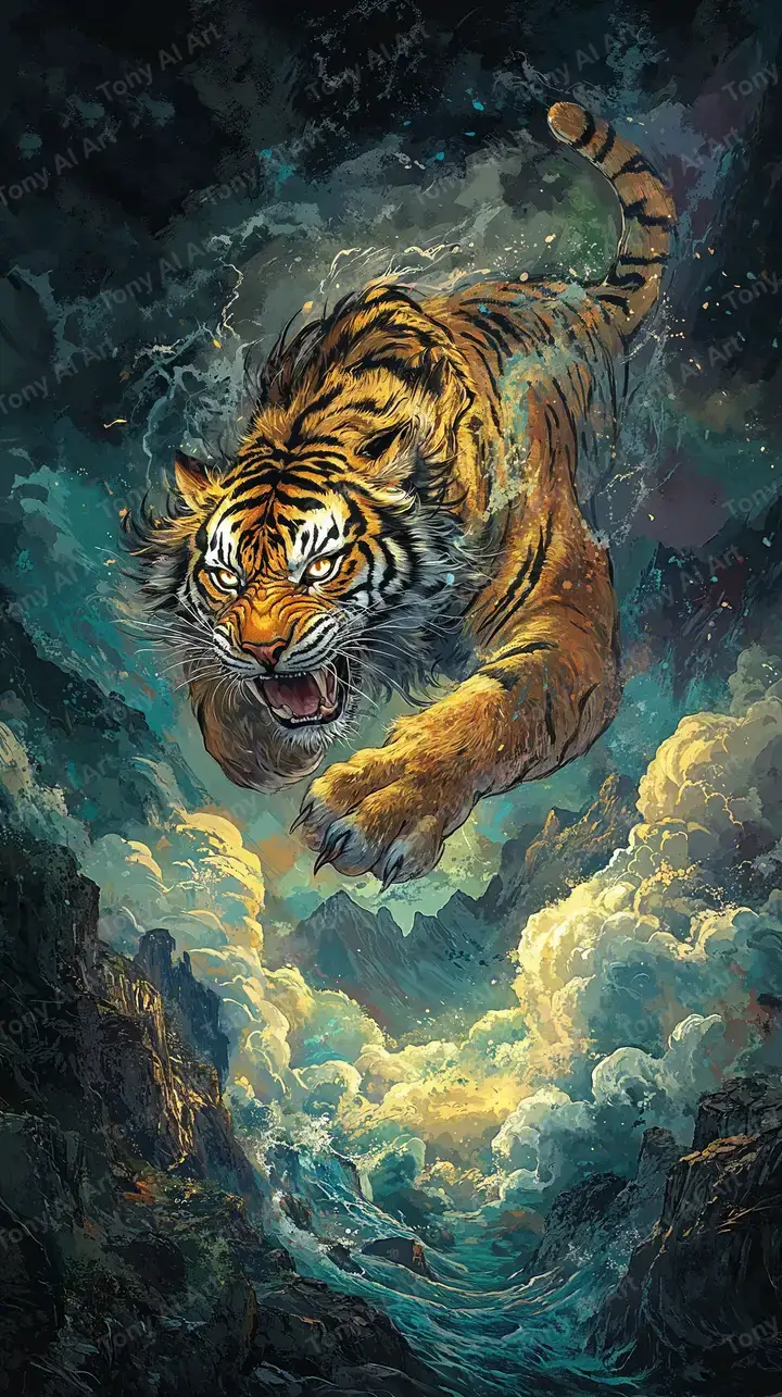 Hình nền hổ vàng phong thủy với hiệu ứng cosmic neon, bầu trời sao đêm, AI art chất lượng cao, tải miễn phí.