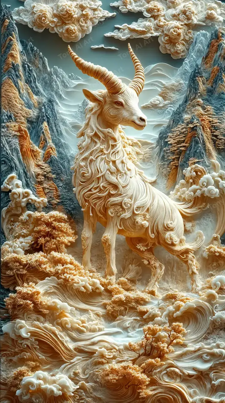 Hình nền AI art dê huyền bí, style điêu khắc 3D relief, cảnh núi mây tơ vàng kim, hiệu ứng công nghệ fantasy thần thoại.