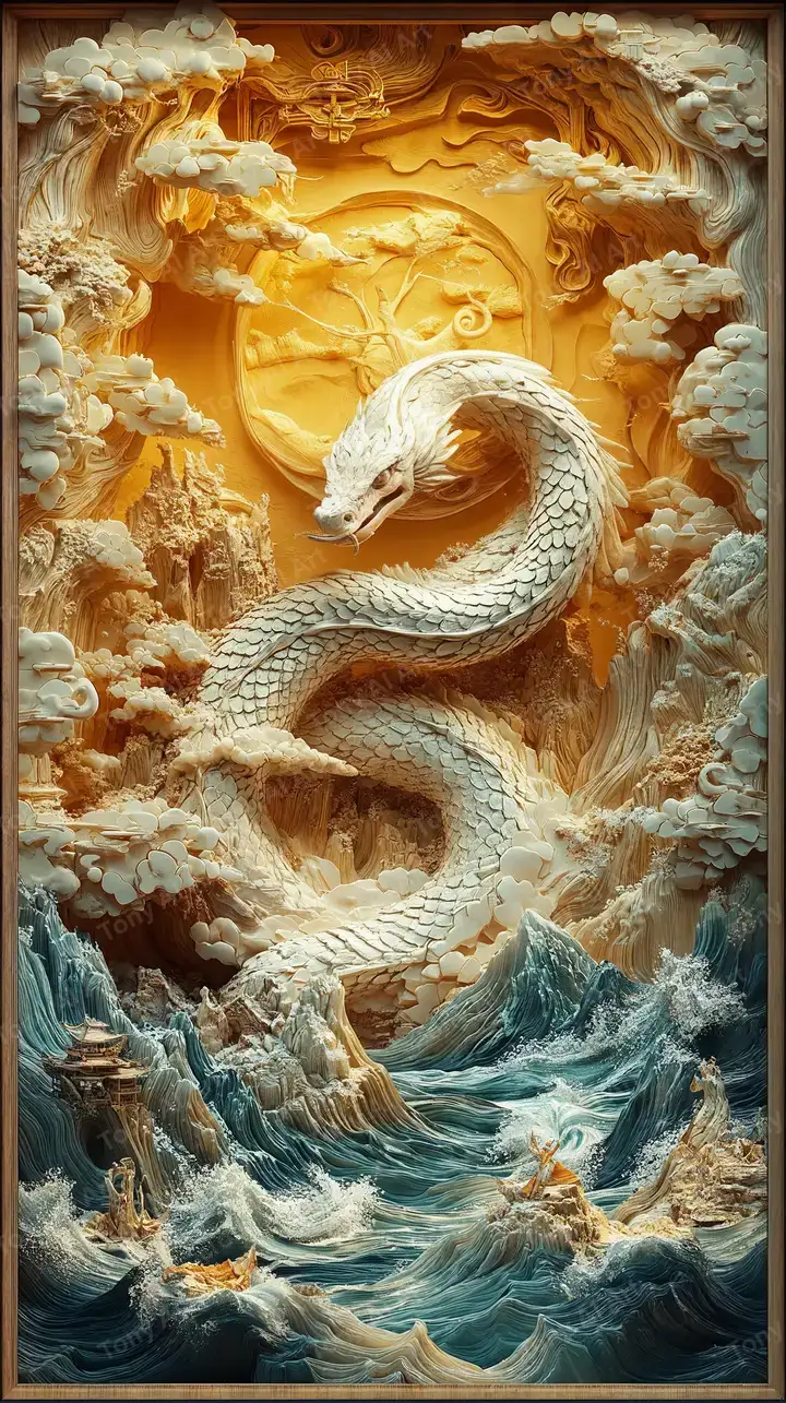 Hình nền rồng trắng phong thủy AI art 4K với hiệu ứng 3D nổi, bối cảnh sóng nước tuyệt đẹp. Tải miễn phí cho máy tính.