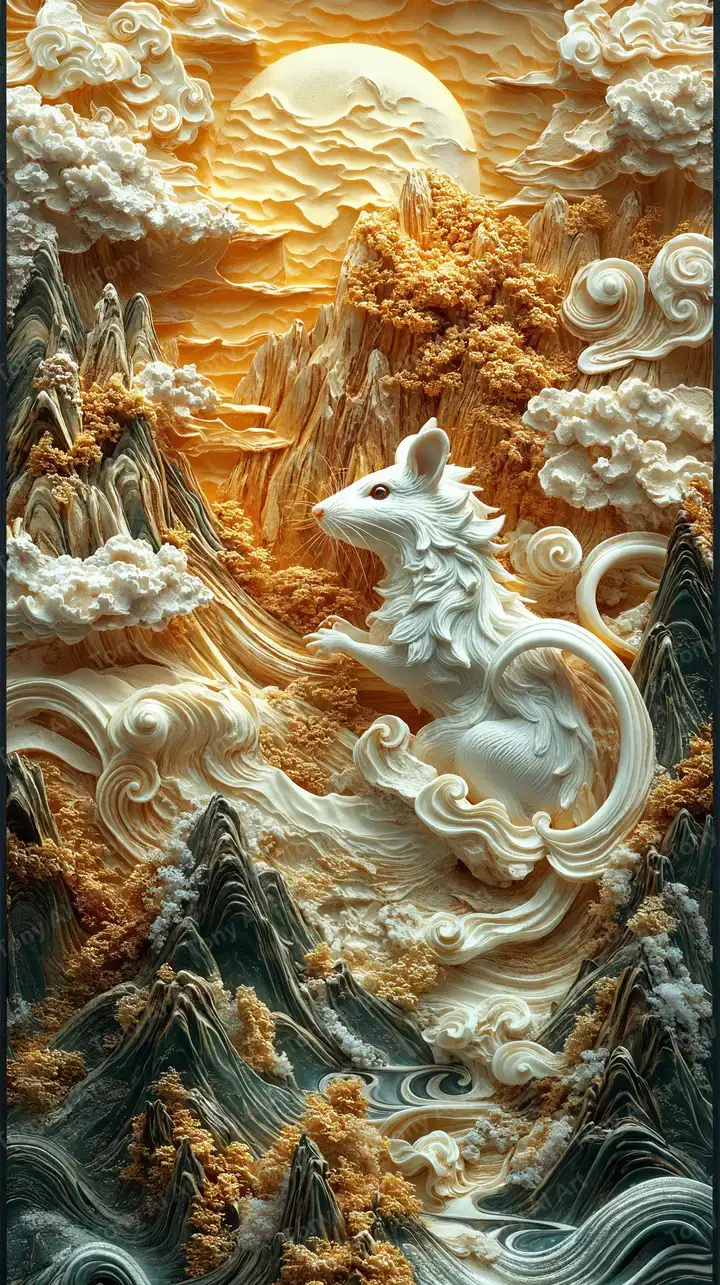 Hình nền chuột vàng phong thủy AI art, chạm khắc 3D relief neon, bối cảnh núi non mây, tải miễn phí 4K.