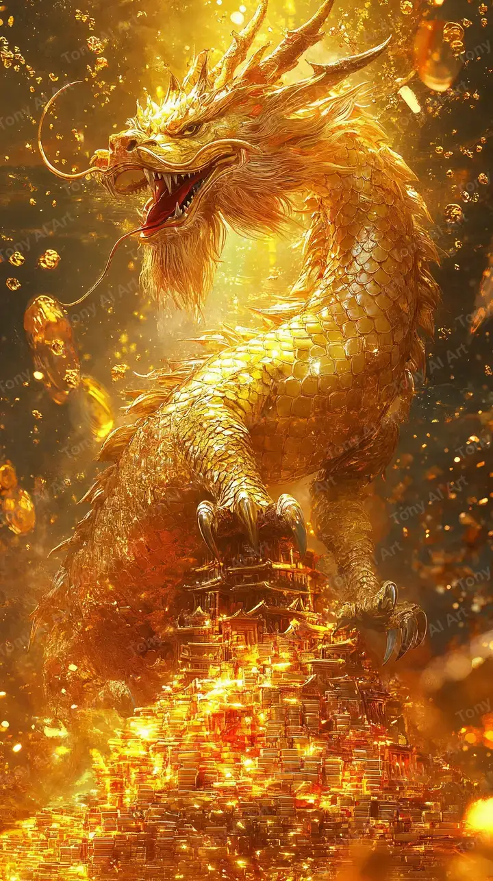 Hình nền rồng vàng phong thủy AI art, hiệu ứng lửa neon cosmic với particle glow, tải 4K miễn phí.