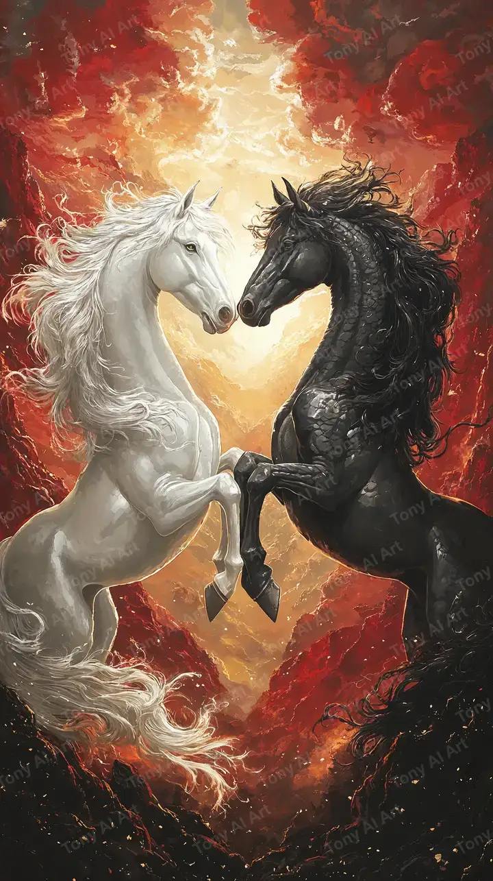Hình nền ngựa trắng đen phong thủy cân bằng âm dương, lửa cosmic neon glow, AI art 4K tải miễn phí.