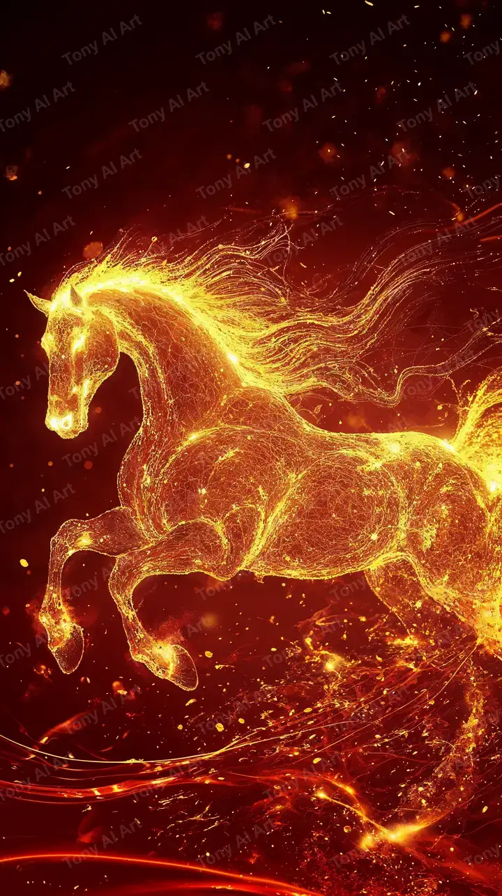 Hình nền ngựa lửa vàng neon cosmic AI art, hiệu ứng particle sáng rực, tải miễn phí 4K.