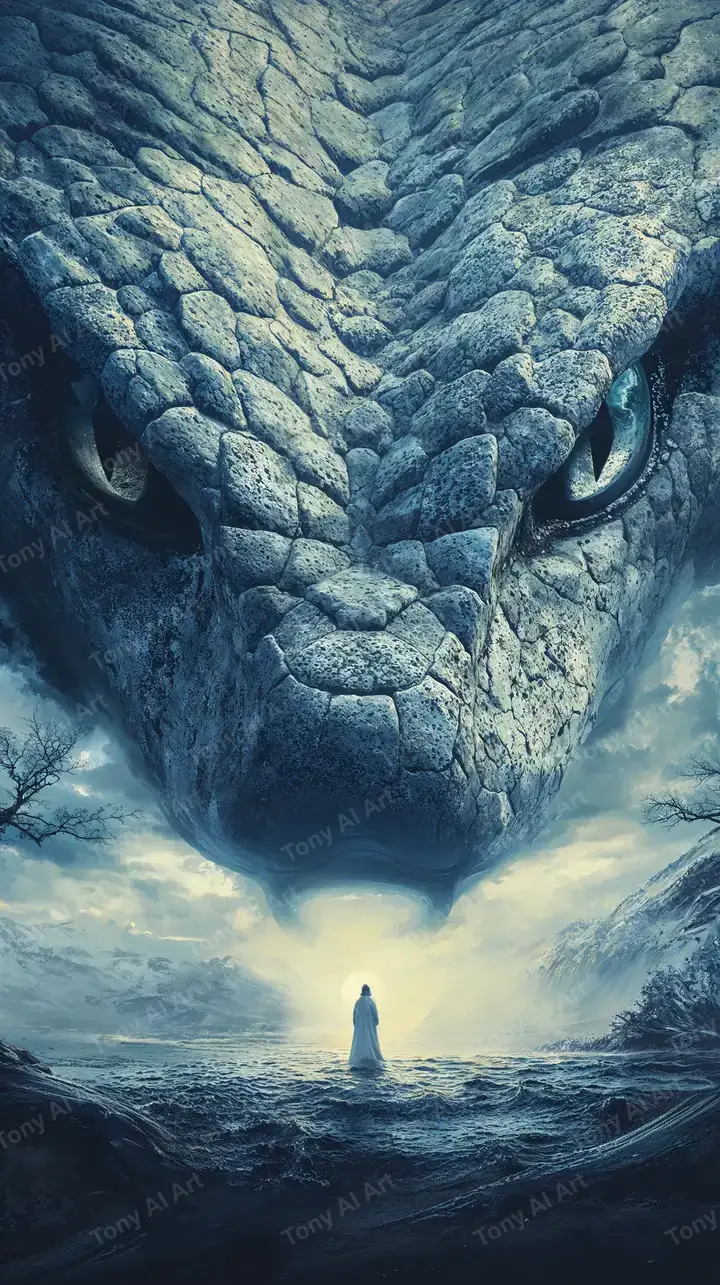 Hình nền rồng thần linh AI art, khuôn mặt đá khổng lồ nhìn xuống, hiệu ứng cosmic xanh vàng, tải miễn phí 4K.