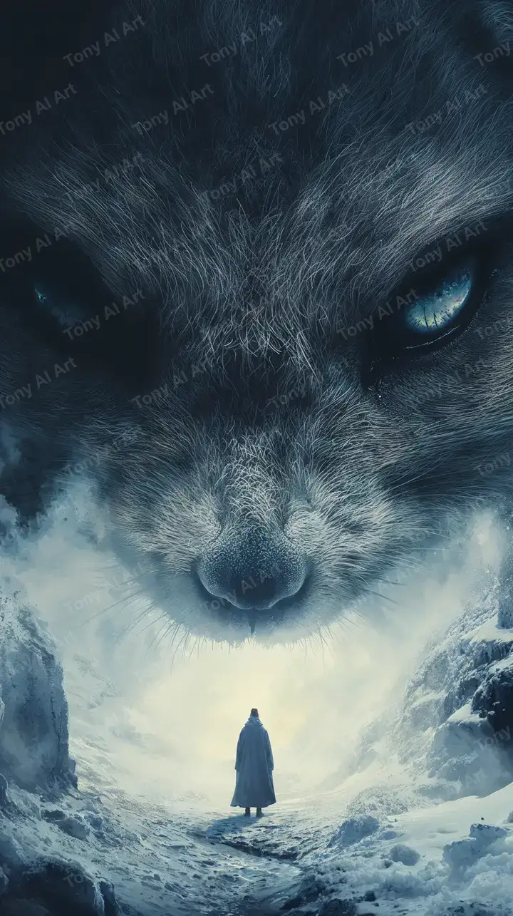Hình nền AI art mèo huyền thoại khổng lồ, mắt xanh sáng cosmic, cảnh tuyết lạnh lẽo, tải 4K miễn phí.