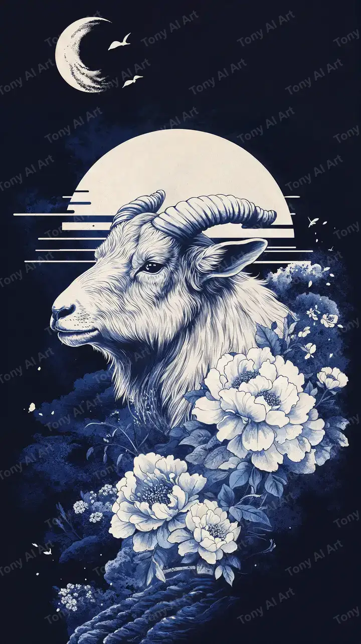 Hình nền dê phong thủy AI art, phong cách retro tối giản với hoa lớn, hiệu ứng neon, tải miễn phí 4K.