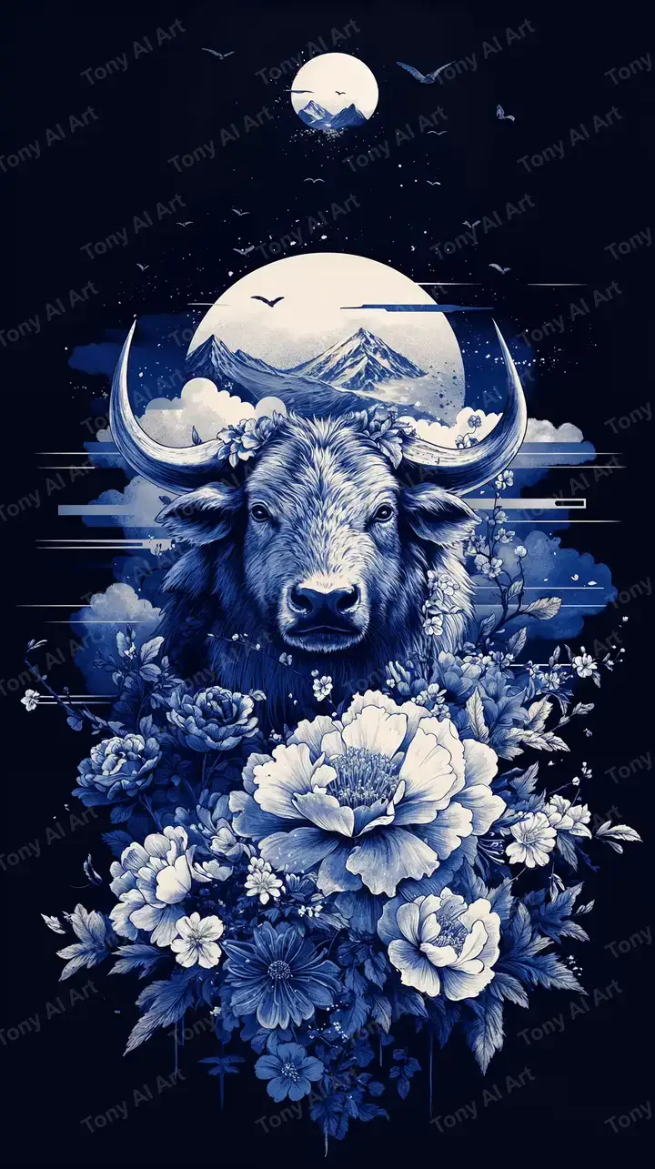 Hình nền bò phong thủy với mặt trăng tròn, hoa mẫu đơn xanh trắng, hiệu ứng neon cosmic 4K, tải miễn phí.