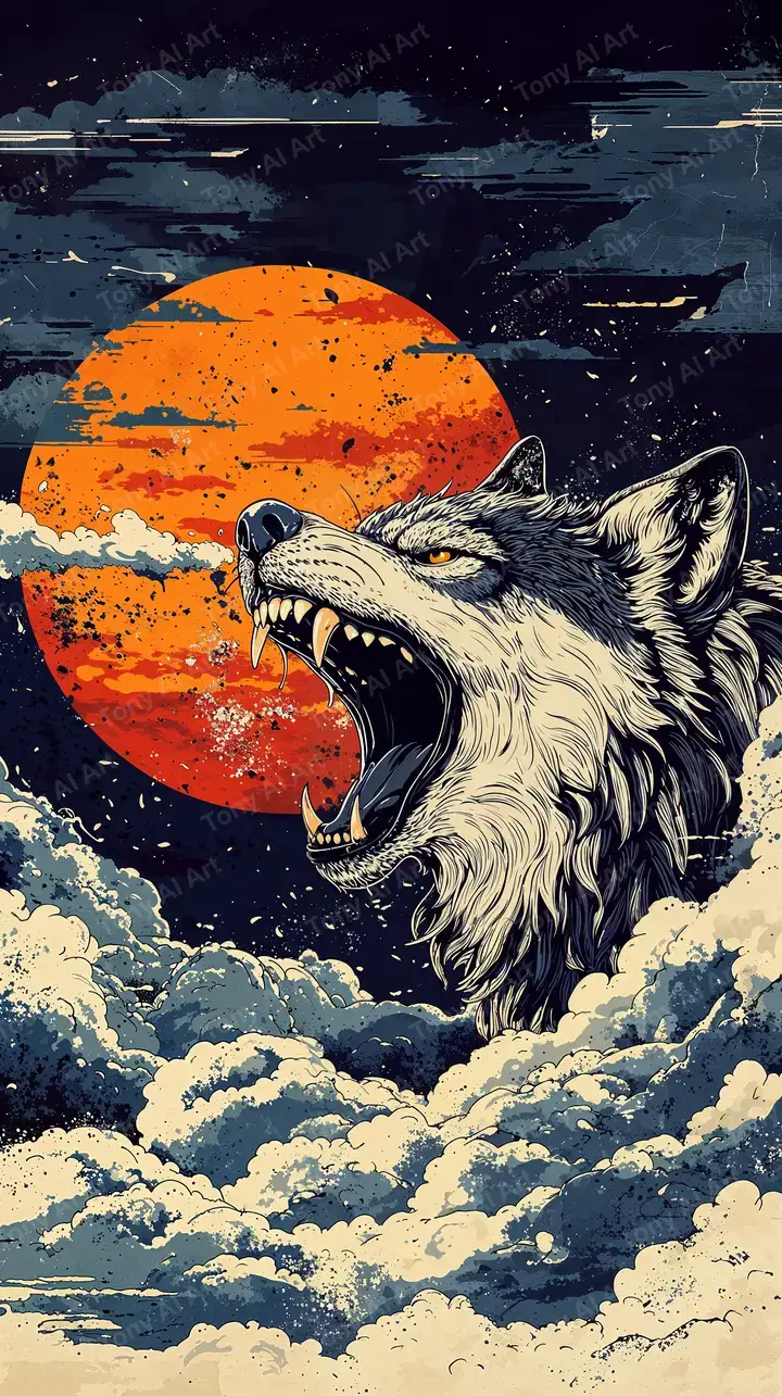 Hình nền sói gầm mặt trăng cam phong cách retro ukiyo-e, hiệu ứng cosmic vintage, tải miễn phí 4K.