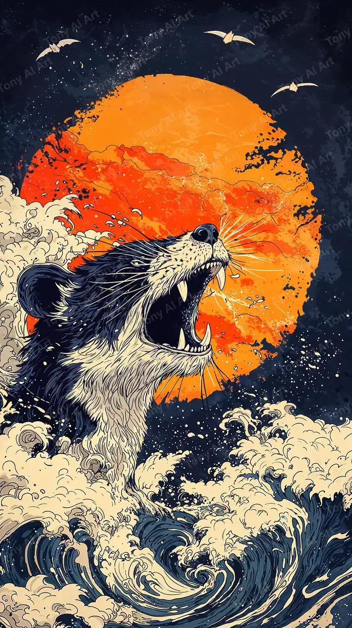 Hình nền sư tử vàng phong thủy AI art với mặt trời cam, sóng biển Hokusai, bầu trời đêm cosmic, tải 4K miễn phí.