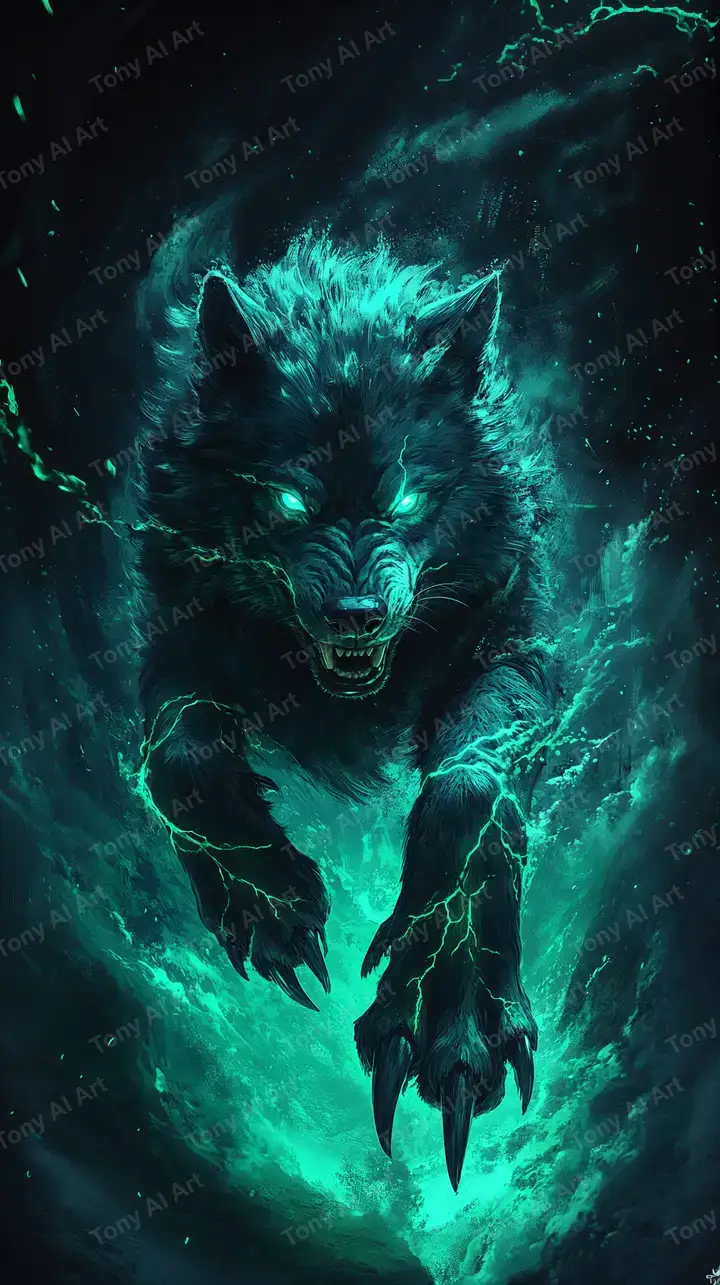 Hình nền sói neon cosmic AI art, hiệu ứng neon glow bí ẩn, tải miễn phí 4K.