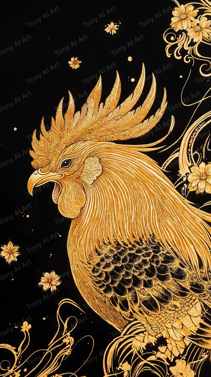 Hình nền phượng hoàng vàng kim phong thủy AI art, hiệu ứng line art tinh xảo, tải miễn phí 4K.